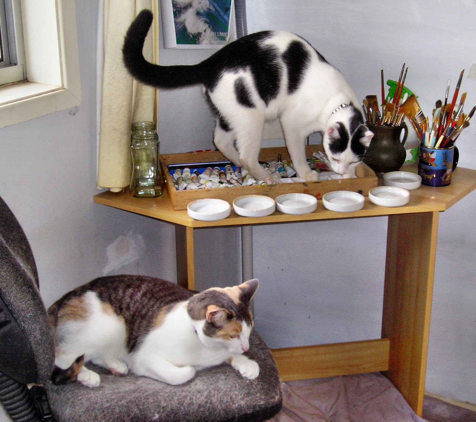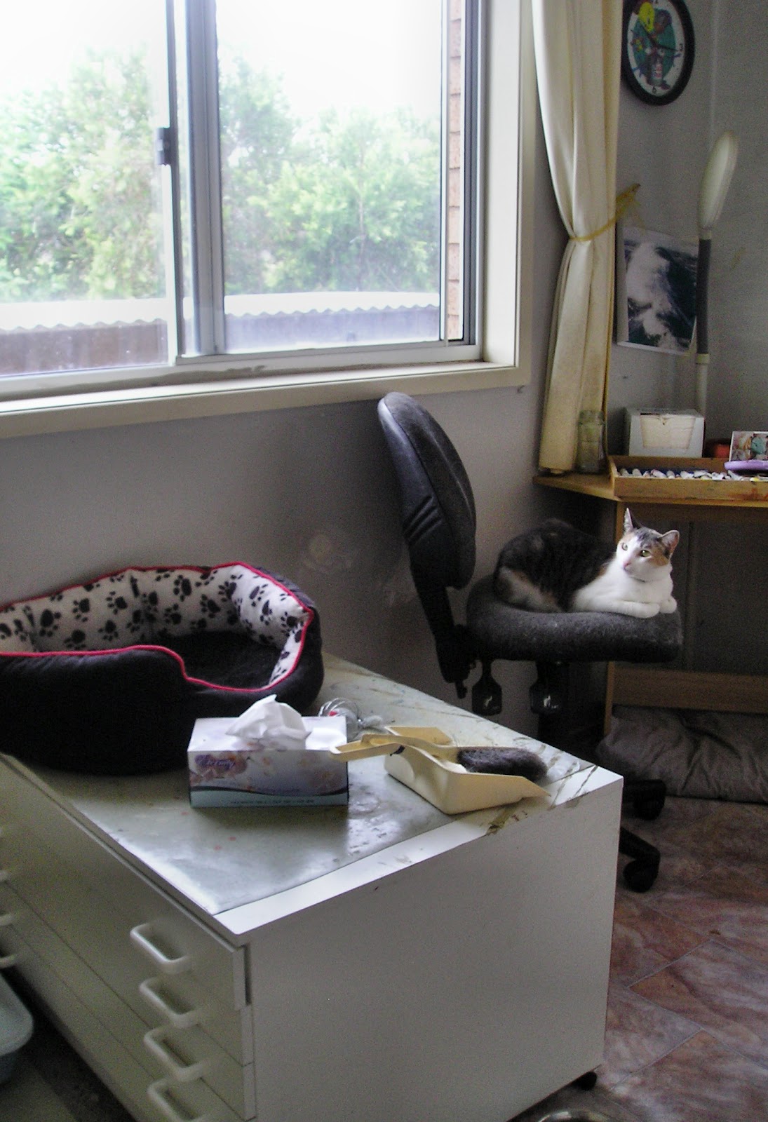 Cali is quite convinced the chair in the room is hers and she refuses to move. When I go in to paint we have a power struggle for a few minutes till she hops down ... usually to curl around my feet .... lol.